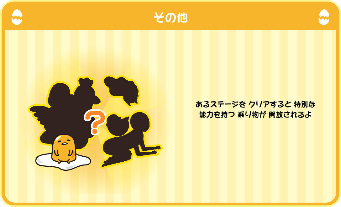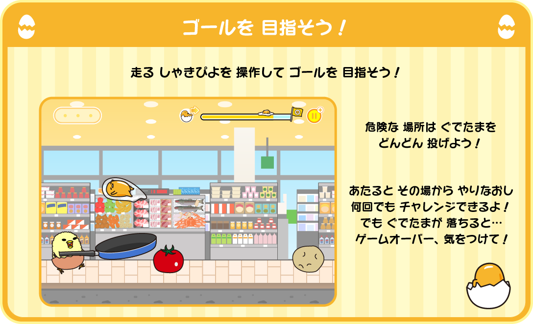 ぐでたまが 乗り物に 乗って、ゴールを 目指す